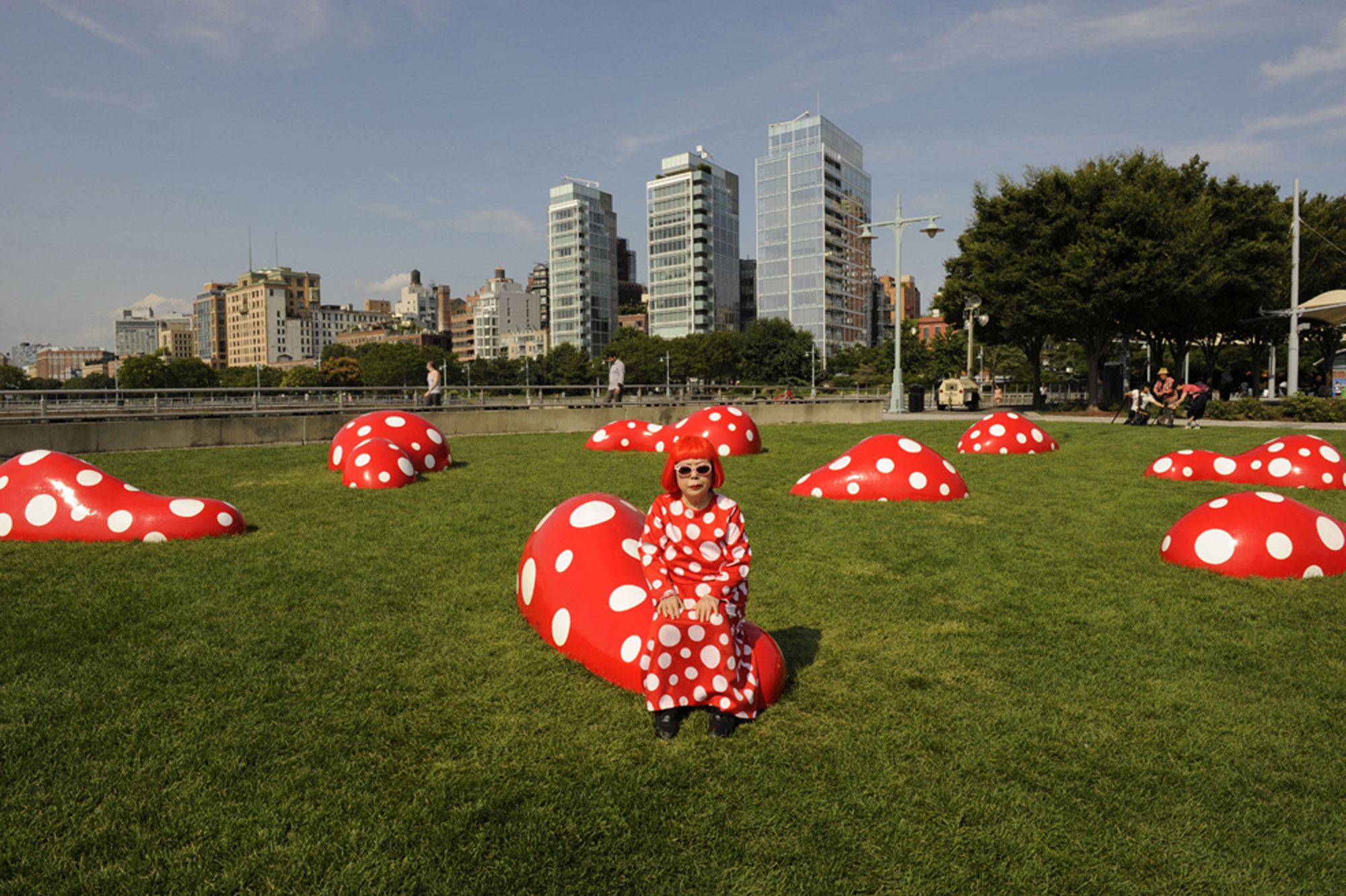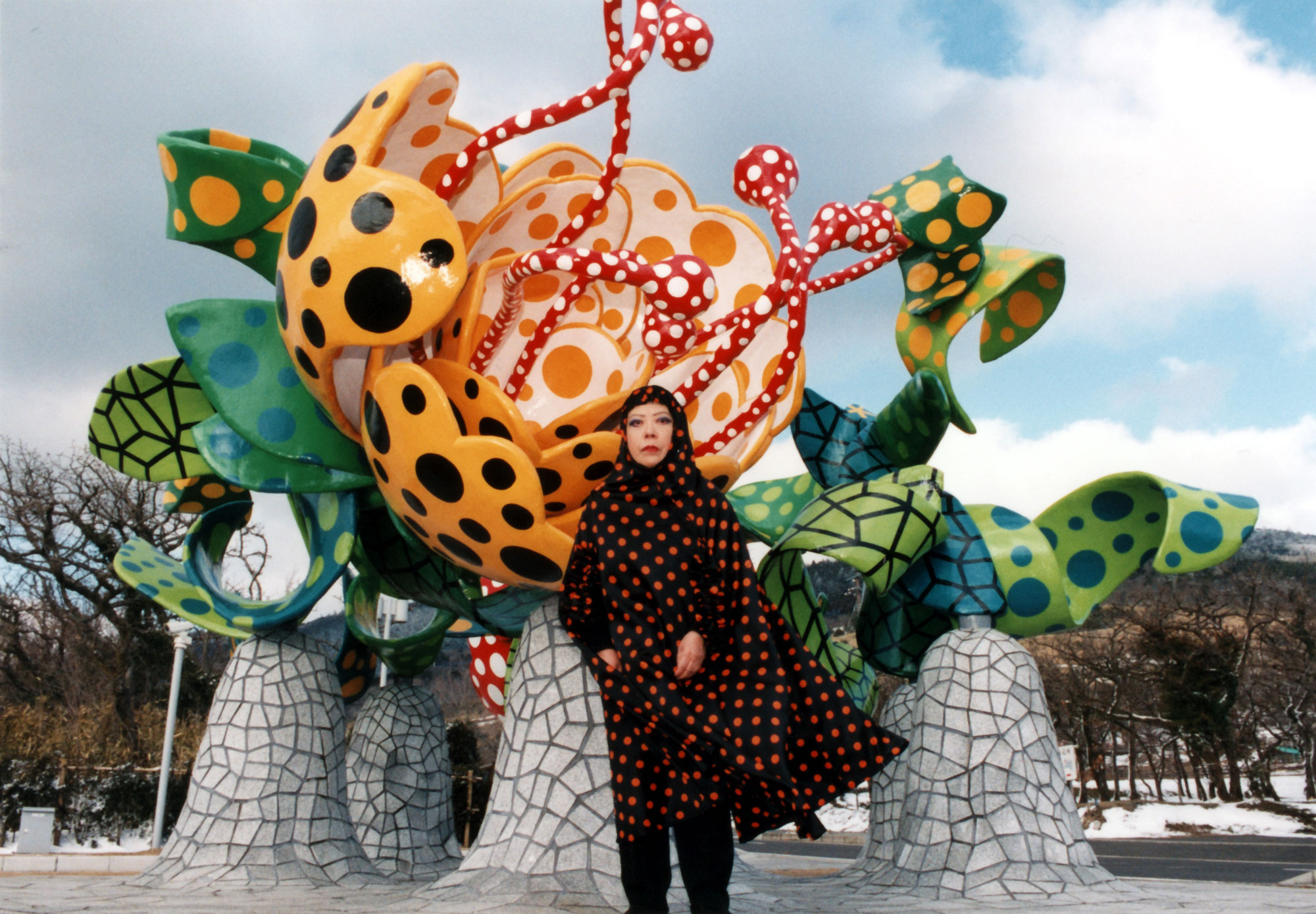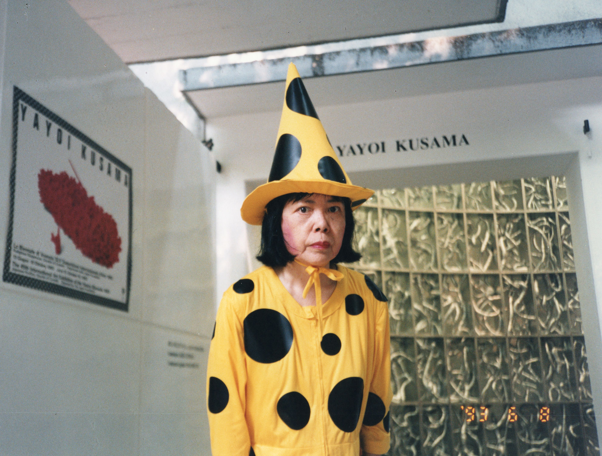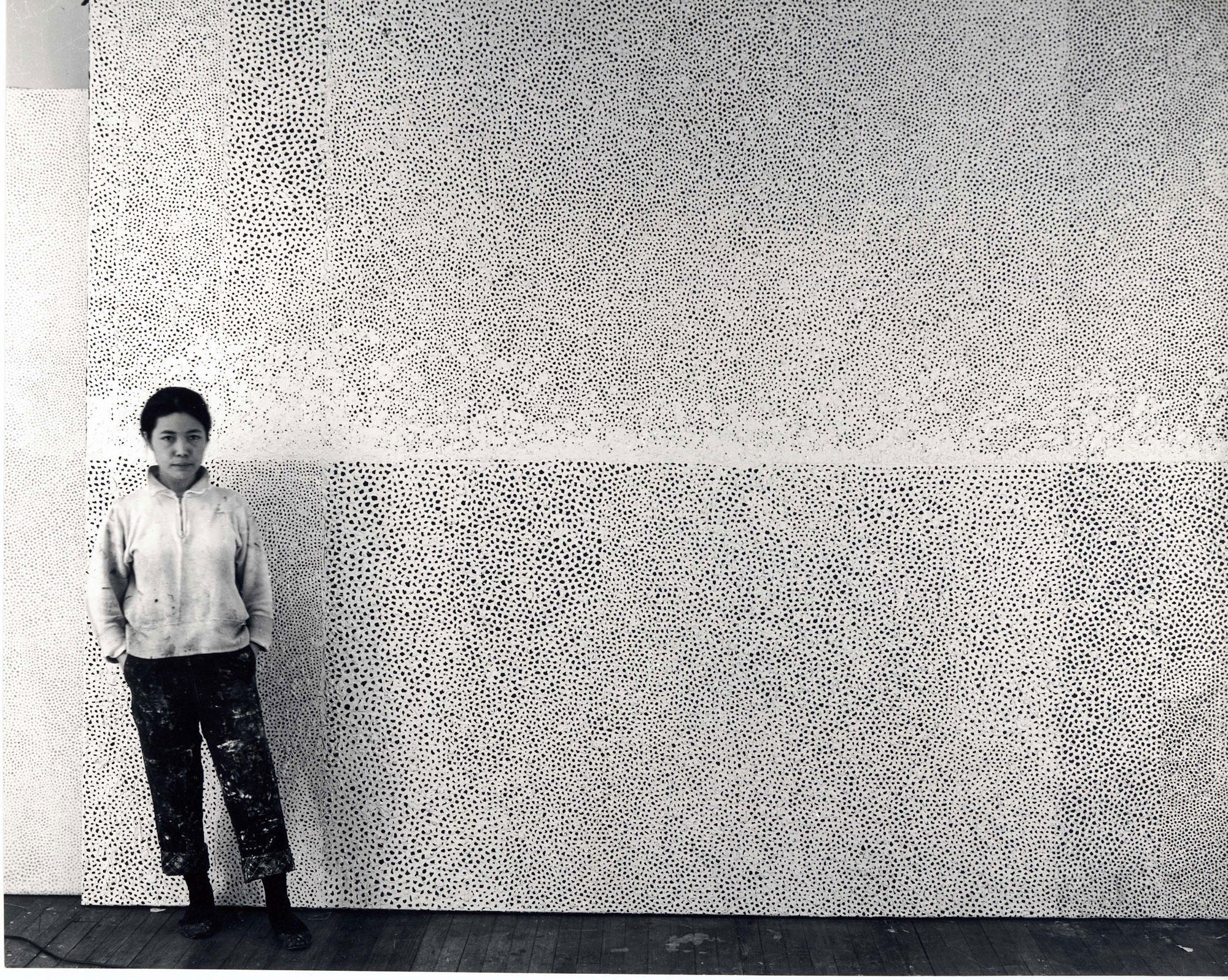 1957年渡米。翌年より、ニューヨークを拠点にネットペインティング、ソフトスカルプチャー、鏡や電飾を使ったインスタレーションなど、革新的な作品を次々と発表、単一モチーフの強迫的な反復と増殖による自己消滅という芸術哲学を打ち立てた。また、ボディ・ペインティング、ファッション・ショー、反戦運動を含むハプニング、映画制作、新聞発行など、活動の領域を自ら切り開き、前衛芸術家としての地位を確立した。